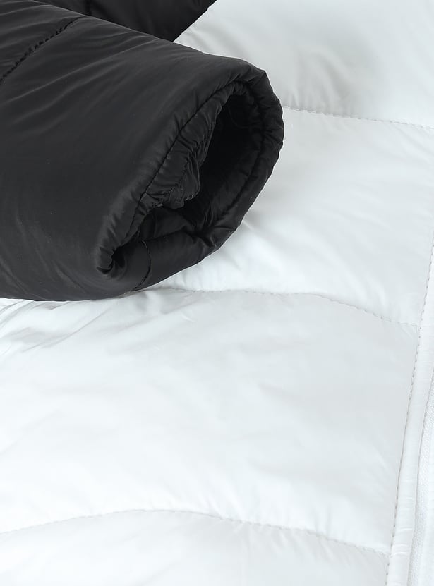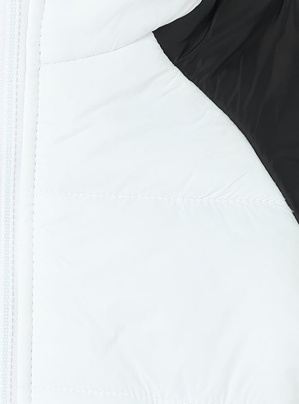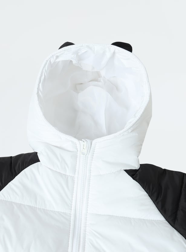 Keep him cosy and stylish with this colorblocked puffer jacket. Featuring a playful panda theme with adorable applique ears, a hooded neck, and full sleeves, this jacket is designed for warmth and comfort. The convenient zip closure adds practicality, making it the perfect outerwear choice for chilly days and fun outdoor adventures.
